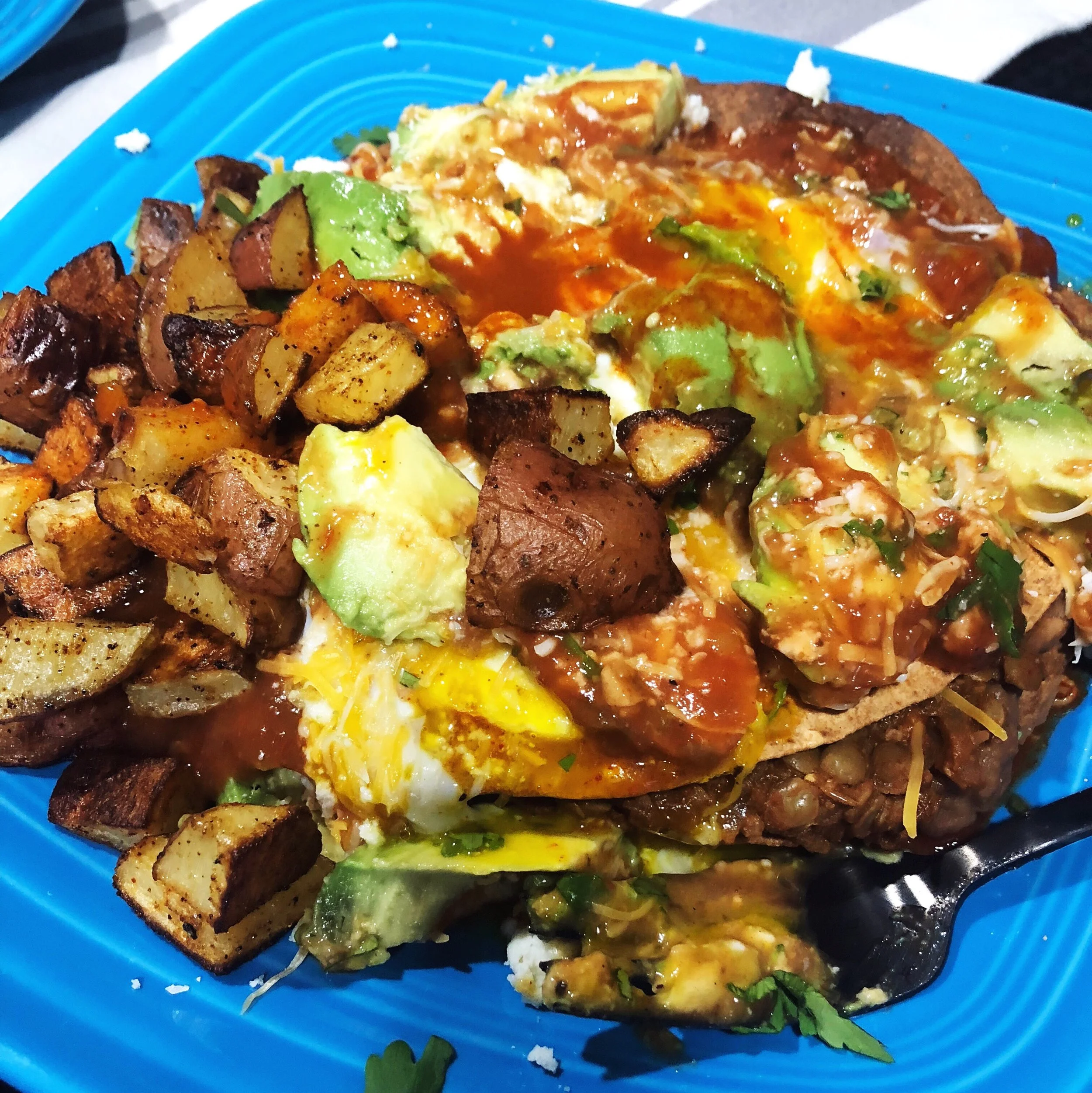 According to good ole Wikipedia, “the basic dish consists of fried eggs served upon lightly fried or charred corn tortillas topped with a salsa fresca made of tomatoes, chile peppers, onion, and cilantro. Refried beans, Mexican-style rice, and slices of avocado or guacamole are common accompaniments, with cilantro as a garnish.” Untraditional variations include flour tortillas instead of corn and pureed chile or enchilada sauce instead of salsa fresca.