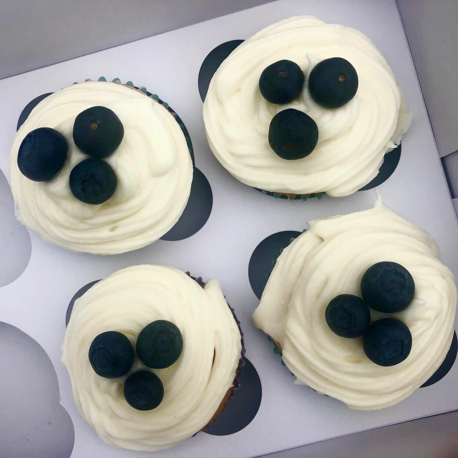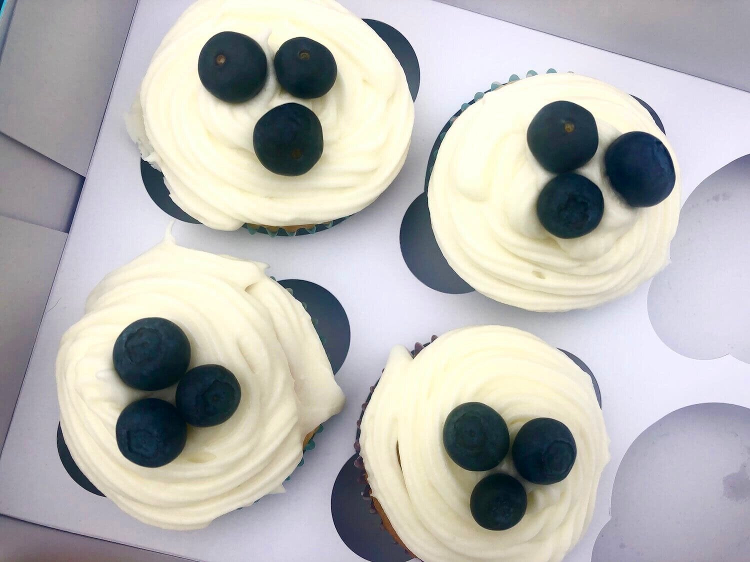 4) In a bowl, beat the butter, lemon juice and cream cheese until smooth. Add the powdered sugar a little bit at a time and beat until desired consistency. Pipe onto the cooled cupcakes and garnish with fresh blueberries.